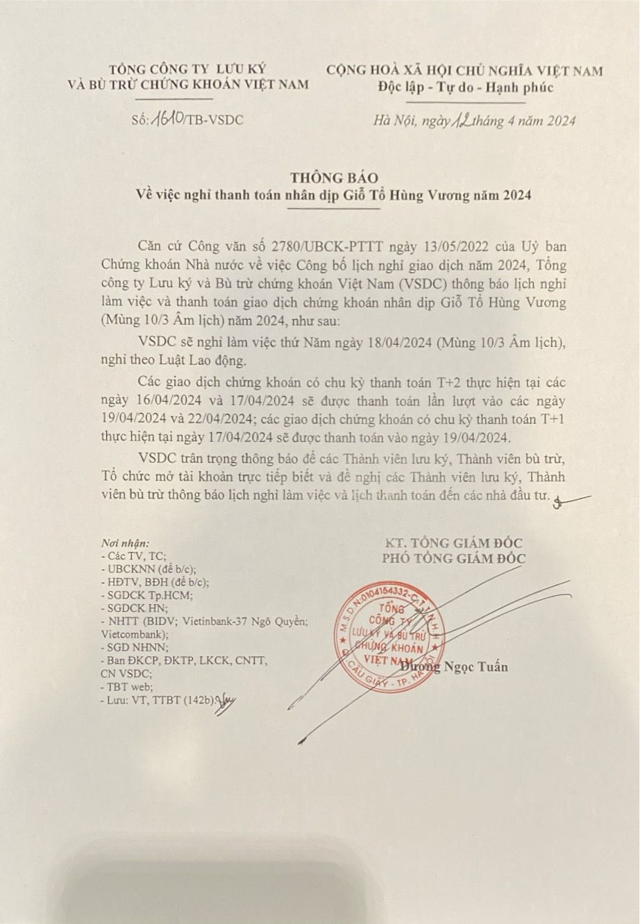 Thông báo về việc thanh toán bù trừ nhân dịp Giỗ Tổ Hùng Vương năm 2024